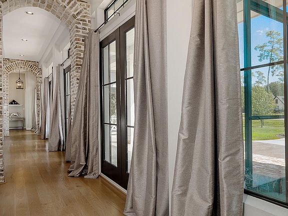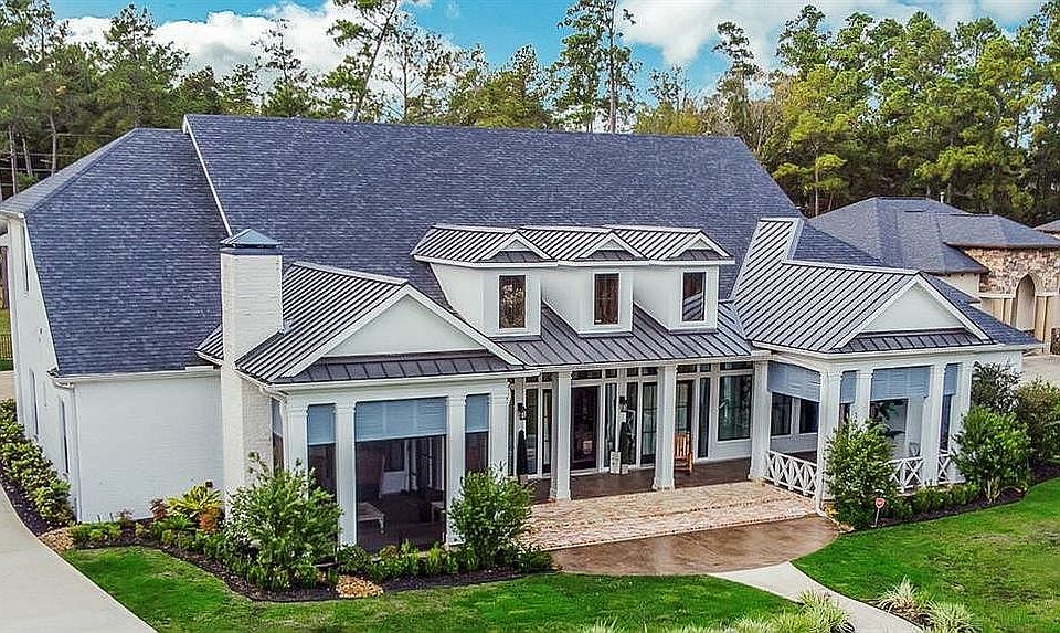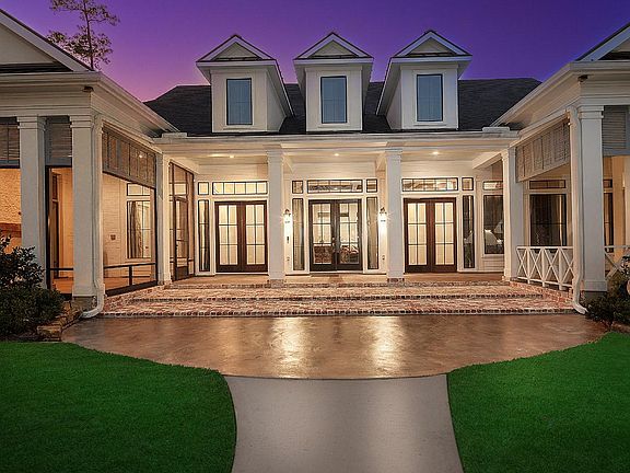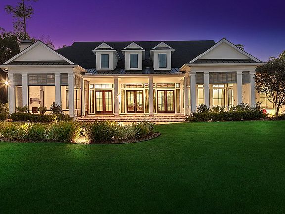 Transitional farmhouse style home on 2 fenced acres in Benders Landing Estates! Impeccably maintained, and pride of ownership is apparent throughout. A gated motor court leads to a 4 car garage; covered front porch, LED lighting, Nest fire and carbon monoxide monitors, Ring doorbell system, surround sound speaker system, whole house generator, concrete floors, amazing built-ins and tons of windows bathe the home in natural light. This home lives like a one story, with the owner's retreat and two bedrooms downstairs! Formal dining and study with French doors; open concept kitchen with wood beam ceiling, quartz counters, SubZero fridge, U-Line beverage fridge, walk-in pantry and under cabinet lighting overlooks the breakfast rom and den; guest bedroom with full bath, fully furnished game room and media up with new Sony projector and screen, and adjacent wet bar. Screened in porch with fireplace opens to a refreshing pool with fire bowls and fountains, and a brand new cedar privacy fence!