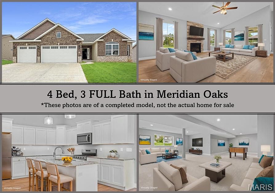 MERIDIAN OAKS (GLEN CARBON, IL) • EDWARDSVILLE SCHOOLS Don’t miss your opportunity to own a 4-bedroom, 3-full-bath home in the highly sought-after Meridian Oaks community, located within the award-winning Edwardsville School District. This beautifully finished home offers an open-concept layout with a large living room featuring a vaulted ceiling and a gas fireplace with stone surround—creating a warm, welcoming centerpiece for everyday living and entertaining. The upgraded kitchen includes granite countertops, an oversized center island, white cabinetry, and a generous pantry, offering exceptional storage and prep space. The primary suite provides a private retreat with dual vanities, a large tile shower, and a walk-in closet. A split-bedroom design adds privacy and convenience, paired with two additional main-floor bedrooms and a full bath. The WALKOUT lower level expands your living space with a spacious family room, dedicated game or bonus area, a fourth bedroom, and a full bath—ideal for guests, extended family, hobbies, or work-from-home flexibility. Outdoor living is enhanced by a covered patio off of the main level AND a patio off the walkout basement door, both overlooking a large backyard, perfect for grilling, gatherings, and play. Additional highlights include main-floor laundry and a 3-car garage for vehicles, storage, or workspace. Meridian Oaks offers a prime location close to bike trails, dining, shopping, and vibrant local nightlife, along with easy access to major commuting routes. This home delivers the right combination of space, convenience, and community lifestyle. Schedule your private tour with your favorite agent today and experience everything this home has to offer. PLEASE NOTE: The builder has a fully built home with this floorplan that is MOVE-IN ready. Have your agent call the listing agent for more details. FINISHED PHOTOS ARE OF A COMPLETED MODEL AND THOSE FEATURING FURNITURE ARE VIRTUALLY STAGED AND FOR DEMONSTATIVE PURPOSES ONLY. THE FLOORPLAN INCLUDED IN THE PHOTO LINEUP IS REVERSED FROM THIS MODEL.