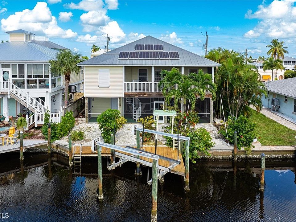 Welcome to island living in the heart of charming Matlacha, one of Florida's best-kept gems! This elevated 2-bedroom, 2-bathroom home on stilts is your perfect waterfront retreat. From the moment you pull into the driveway, you’ll feel a sense of relaxation wash over you. The home features hurricane impact windows, offering peace of mind and year-round comfort. As you step through the front door, you’re greeted by an inviting open floor plan where the kitchen flows seamlessly into the great room—an ideal space for entertaining. Nearly every room in the home offers stunning water views, enhancing the serene island atmosphere. Both bedrooms are generously sized with ample storage, and an additional flex space off the great room could easily serve as extra sleeping quarters or a home office. Step outside to the spacious screened-in lanai, where you can enjoy your morning coffee while watching dolphins and manatees play in the water. Below the home, you’ll find extra storage, a second patio area, and a newer dock for all your boating adventures. This property had minimal damage from Hurricane Ian and no known water intrusion, ensuring it’s ready for you to move in and enjoy. Don’t miss out on this beautiful Matlacha retreat!
