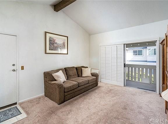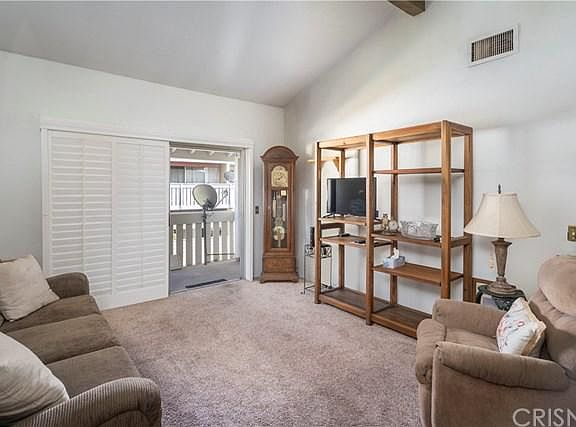 Great upper level Saugus Condo with 2 bedrooms full bath plus quarter bath (sink area). 2 carport parking spots included space 180. Vaulted Ceilings in a large living room which opens up to a covered balcony for outdoor enjoyment. Master bedroom has private sink and mirror that connects to the shared bath. Included in sale is stacked washer/dryer located inside the condo. The HOA includes pool and spa and the community is located near a major grocery store and other shops/restaurants. Check out this super clean home today!