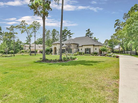 Amazing Mediterranean custom home in the community of Bender's Landing Estates. This unique home features a gourmet kitchen with seeded glass cabinetry and custom wine grotto. The kitchen and family room is beautifully detailed with vaulted, wood beamed ceilings. Stone fireplace and stone cook top surround to the ceiling. The functional split plan offers all 4 bedrooms down with media room and game room with private balcony upstairs. Water softener, 3M film solar windows, hand scraped hardwood and travertine floors, 3 car epoxy floor garage with workshop and built ins. Escape in the serene country setting of the beautifully landscaped 1 acre lot equipped with sprinkler system. Convenient access to downtown via 99 and I-45, fine dining and shopping and Conroe ISD schools. The community provides amenities such as hike/bike trails, stocked lakes, parks, pool with splash pad, clubhouse with fitness center, basketball and tennis courts, soccer and baseball fields. Welcome Home!