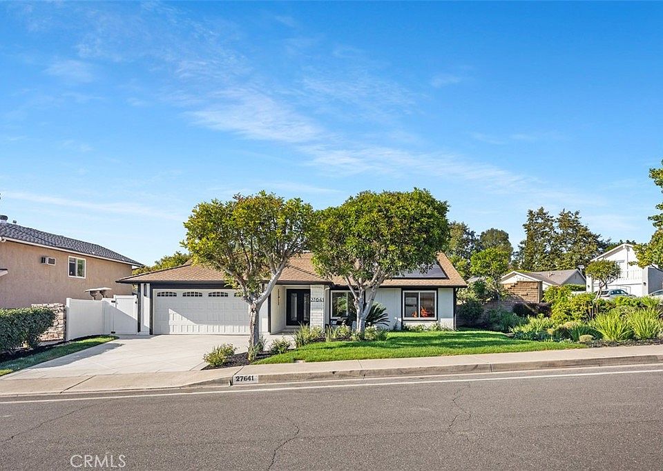 A stunning single-level retreat where modern design meets everyday comfort in Mission Viejo’s sought-after New Castille community. This fully renovated 3-bedroom, 2-bath residence offers 1,546 sq ft of beautifully reimagined living space on a large lot. The heart of the home is a true chef’s kitchen, crafted for both form and function, with custom cabinetry, floating white oak shelves, sleek quartzite counters, a massive center island, stainless appliances, and an impressive 8-burner professional range with double oven. Open-concept living spaces flow effortlessly, featuring wide-plank wood floors, designer lighting, and sliding glass doors that open to an expansive patio – an entertainer’s dream for outdoor dining, gatherings, and relaxation. Both bathrooms showcase elegant tilework, frameless glass showers, and high-end finishes that exude spa-like sophistication. The exterior is equally impressive with a freshly painted façade, newly poured driveway, manicured landscaping, and a reimagined backyard framed by a rebuilt retaining wall and lush greenery. Solar panels (leased) and a finished garage with epoxy flooring adds the final touch. Ideally located near Lake Mission Viejo, parks, shopping, and top-rated schools, this home delivers refined style, modern comfort, and effortless California living at its best.