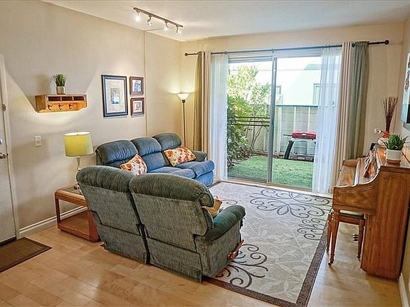 Adorable and well-kept New Horizons Condo with 2 bedrooms and 1 bathroom. Living room is open to the dining area and the kitchen. Wood floors in the living room area. Large slider off of living room that leads to a generous patio area with eco-friendly artificial grass. Ceiling fan in dining room area. Large Master bedroom with access to bathroom, which has two vanity areas with sinks. Stackable washer/dryer is in the hall. HOA offers a gated area with a sparkling pool and spa. Close to schools, walking distance to shopping, restaurants and transportation.
