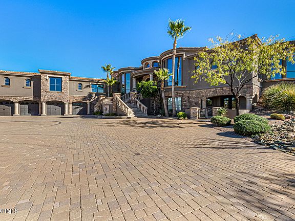 Prepare to be amazed! Scenic views abound at this 6 bedromm 9 bath privately gated estate now for sale in Pinnacle Vista! Nestled on a HUGE 3.8 acre cul-de-sac lot w/fantastic mountain views, this wonderful abode also boasts tasteful stone accents, a manicured desert landscape, an 8 car garage w/built-in cabinets and a paver driveway. Come inside to discover a circular foyer w/stylish columns, which flows seamlessly into a formal dining room w/a fireplace, perfect for hosting a dinner party! High ceilings, travertine stone flooring, plantation shutters, dazzling light fixtures, and trending palette throughout. Continue into the spacious great room, showcasing a 2nd fireplace, built-in entertainment niche, pre-wired surround sound, and a wet bar w/an adjoining wine cellar. The gourmet kitchen is worthy of a chef, comprised of wood cabinetry w/crown moulding, granite counters, tile backsplash, stainless steel appliances, 2 farmhouse sinks, a walk-in pantry, a center island w/a breakfast bar, and a breakfast area. Double doors open up to a cozy den, ideal for an office or reading nook! You'll love the grand primary suite, featuring a 3rd fireplace, another wet bar, direct outdoor access, a carpeted walk-in closet, and a lavish ensuite w/dual vanities plus a jetted tub. Don't forget about the large bonus room w/a 3rd wet bar, where you can spend quality time w/friends & loved ones. The guest quarters also include a sizeable living area w/a kitchenette plus a 4th and final fireplace! Film enthusiasts will also be delighted to find a home theater w/yet another wet bar. Lastly, the resort-like backyard includes a covered patio, extended paver seating areas, a lovely gazebo, a pergola w/a built-in BBQ, fire pit, artificial turf, a tennis court, and a sparkling blue pool/spa combo w/a rock waterfall! This is the opportunity of a lifetime, don't let it get away!