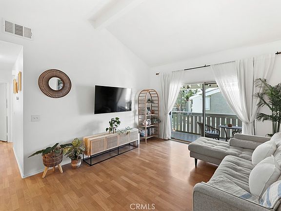 Welcome home to this beautiful upper level two bedroom, two bathroom condominium, located in the heart of Saugus. This light and bright end unit features an open floor plan that includes kitchen and dining overlooking the spacious living room with vaulted ceilings and direct access to the covered outdoor balcony. Updated laminate flooring throughout carries you to the two large bedrooms, each with en suite bathroom and walk-in closets. The primary bedroom and bathroom have been beautifully renovated for a fresh look with new vanity, mirror and lighting. Additional updates to the home include fresh paint, new light fixtures, ceiling fans, full tilt TV mount and Google Smart thermostat, all of which add to the modern and welcoming feel of this lovely home. Enjoy the convenience of in unit laundry and two covered, side-by-side parking spaces each with storage. Fantastic location features community pool and spa, close to local shopping, restaurants, schools, and within walking distance to beautiful Central Park. With low HOA, inluding water and trash and No Mello-Roos this is a must see!