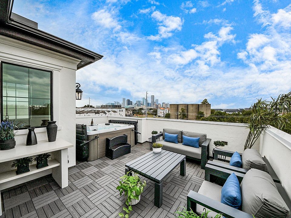 Hot tubCorner unitRooftop deckHigh ceilingsDramatic wall of windowsOutdoor livingCovered patio