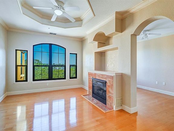 Enjoy resort like amenities and water access in this 24 hour guard gated waterfront community called The Grand Bellagio at Baywatch on Old Tampa Bay in Clearwater, Florida. This nicely appointed residential condominium Firenze model is an open, light and bright split bedroom plan and features 2 primary suites each with private bath; a separate study/office/den that is 11/08 and right off the living room; wood kitchen cabinets with Bordeaux granite countertops and breakfast bar for 4, decorative backsplash plus all stainless steel appliances; 45 1/4 inch baseboards throughout, crown molding in living, dining, den/study, kitchen, foyer and both bedrooms; engineered hardwood floors throughout; ceramic tile in bathrooms, utility room and kitchen. Full size wsher and dryer in separate utility room off kitchen; built-in open TV cabinet area above tiled gas fireplace; updated bathroom faucets, toilets and mirrors; primary bathroom 1 has updated double vanity and granite countertop; second primary suite has double4 vanity and granite countertop; each bedroom has a 9 x 5 walk in closet with generous shelving; gas hot water heater in 014 and HVAC system in 2017. Assigned parking space 26 steps from your condo. Grand Bellagio offers 24 hr guardhouse with check in guard pavilion; poolside cabanas, geo-thermal heated pool and spa; 6800 hsf clubhouse with 24 hr fitness center; owner conference room; billiards room & social villa; 1 1/2 mile lighted promenade, fishing area, gazebo (2); playground, sand volleyball and tennis courts and outside grills in front of each building. Kayak, entertainment and sun deck pavilions that are anchored to the "Docks at Bellagio marina are currently under renovation and inaccessible. Room measurements are approximate. Fabulous Clearwater location with easy access to Tampa International Airport or St Pete/Clearwater Airport, close to shopping malls in Clearwater, International Mall in Tampa and 10 minutes from the beach without beach prices. Schedule your private viewing today. NO SHORT TERM LEASES AND NO AIRBNB ALLOWED. New roofs, new windows and exterior renovation project for all community buildings completed the end of 2023 into early 2024. Owner has paid in full total invoice of the new impact hurricane windows for the condominium. Also for rent.