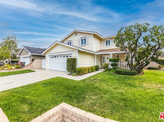Bright and Spacious! This well-maintained home is situated on the corner of a cul-de-sac in a very desirable Santa Clarita neighborhood. Enter through the charming covered front porch to a large living space bathed in natural light with a cozy fireplace, crown molding and recessed lighting. The gourmet kitchen features granite countertops, stainless steel appliances, ample cabinetry and opens to a den with built-in shelving & shutters. The grassy backyard includes a beautiful Magnolia tree & large covered patio, which is perfect for entertaining and enjoying sunny SoCal weather. The first floor completes with a half bath and two car attached garage with built-in storage cabinets and laundry area. A spacious primary bedroom with a large closet and en-suite bathroom awaits you upstairs along with three additional bedrooms and a full bathroom. Many updates throughout, including copper plumbing and dual pane windows. Close to Association pool, tennis courts and park. Low HOA and no Mello Roos. This is a fantastic location!