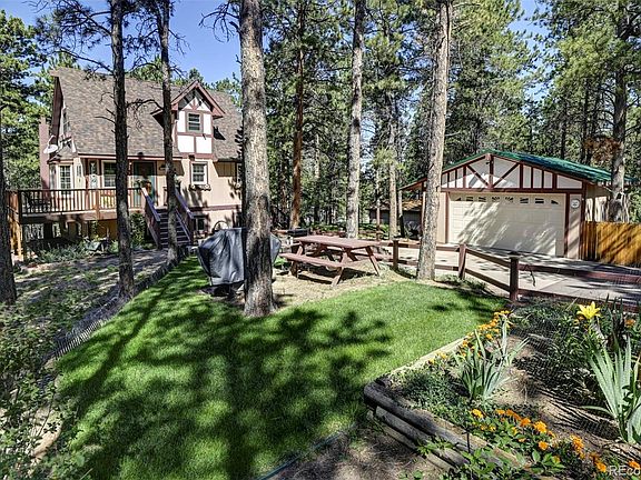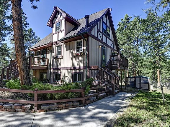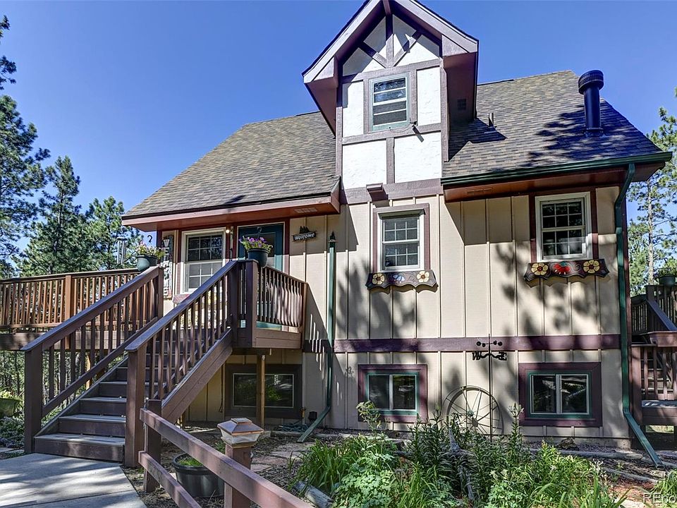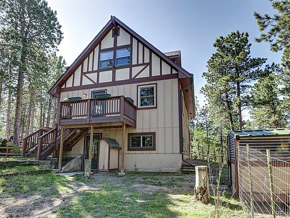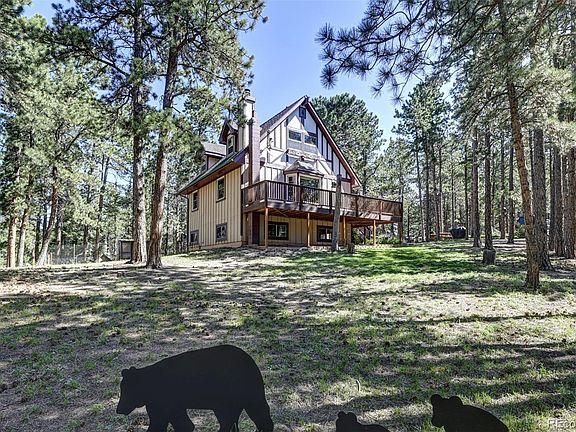 Come in and see your dream home! This gorgeous 1.5 story home sets back on 2.5 acres with lots of beautiful mature trees! It is located a few miles north of the desirable mountain community, Woodland Park. It is mountain living within commuting distance to Colorado Springs. When you arrive at this home, you will notice the fully landscaped yard and the beautiful deck that wraps around the outside of this lovely home. This property also features a detached 2.5 car garage with a workshop, a storage shed and a barn made for 2 horse stalls with a feeding area. The roof on this home was replaced in 2020. When you walk inside this home, you will notice the gorgeous wood fireplace, solid wood doors and the beautiful bay window. The multiple windows on the main level allow lots of natural light to enter the home. The kitchen has nice brick back splash, beautiful wood flooring and some stainless steel appliances. This home has a total of 4 bedrooms and 2.5 bathrooms. When you walk downstairs, you will see the huge living room as well as a beautiful rustic wood stove. This home is agriculturally zoned and has a security system. It also has a dog run and a dog house as well as a kids playhouse. Too many updates and wonderful features to list! This gorgeous home won't last long, come see it today!