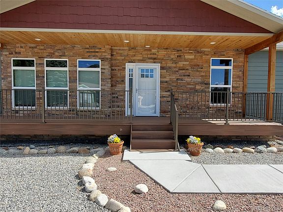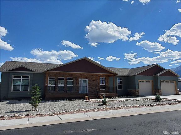 This lovely home is located in Casa Del Rio, Buena Vista's only gated 55+ community. Built in 2019, this home has had just one owner who took meticulous care of the property. It features an open floor plan with coffered ceilings and fans in the living area and primary bedroom. The kitchen is a chef's dream with lots of counterspace, cupboards and a HUGE island (with another sink) for meal prep and gathering around. The dining area opens up to the composite deck for grilling and entertaining. Luxury vinyl planking in the kitchen dining area; tile in bathrooms and carpeting in bedrooms make this home very easy maintenance and comfortable living. Primary bedroom to the East side has an ensuite bathroom with glassed in shower, walk-in closet, double vanity with lighted mirrors, and a linen closet. The two bedrooms to the East share a full hall bath. There is a spacious laundry room with a sink. The attached 2 car garage has a workbench and shelves and an access door to the back yard. Low maintenance xeriscaping with a drip system. This home is located across the street from community mailboxes, so mail retrieval is very easy. Residents of Casa Del Rio have free usage of the clubhouse, community garden and access to private open space along the Arkansas via the River Trail off Aqua Vista Lane between #47 & #48. Locked entrance gates provide this community extra security in the evenings.