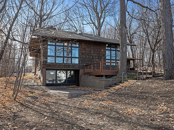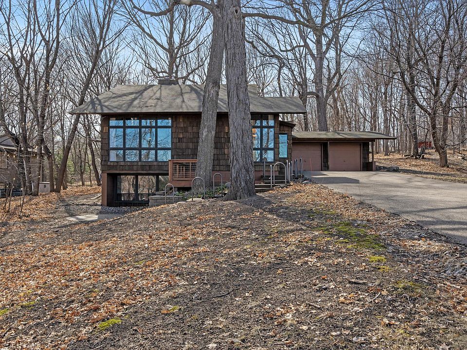 Immerse yourself in the charm of this architecturally stunning home by Arthur Dickey. Admire the character of stained glass windows and the cozy atmosphere of a wood-burning fireplace in the living room. Entertain effortlessly in the spacious dining and living area, accentuated by vaulted ceilings and expansive windows that flood the space with natural light. Retreat to the second level, where three bedrooms await, while the master suite on the third level offers a private sanctuary, complete with lofted views over the living room and convenient privacy doors. Situated on a generous lot with lush trees, the property affords a serene setting with a view of Lake Minnetonka. Deeded lake access is just a short stroll away, completing this desirable package.