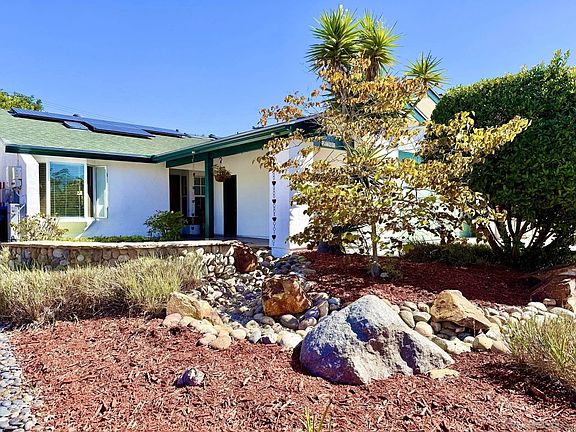 Step into this Exquisite 3 bedroom, 2 bath single-level ranch style home showcasing an abundance of thoughtfully curated upgrades designed for both comfort and efficiency. Highlights include owned solar with battery backup -24 panels, a new roof installed in 2023, and central heating and air. The open-concept kitchen is enhanced with sleek quartz waterfall countertops, while abundant natural light streams throughout the home from three skylights. A spacious family room, Oak Bay dual pane windows, solid hardwood oak flooring in bedrooms, custom Alderwood front door, bay window in living room, solid oak French doors with stained glass in front bedroom, crown molding, double insulation in the attic, and more complete this dynamic residence, blending style, comfort, and efficiency. Enjoy your own outdoor paradise with luxurious covered patio, relaxing hot tub, waterfall pond, custom outdoor lighting front and back, and drought-tolerant landscaping front and back, creating the perfect low-maintenance retreat. Fresh exterior paint and 2-car garage complete this beautifully updated residence -- all set on a double quiet cul-de-sac street close to everyday conveniences.