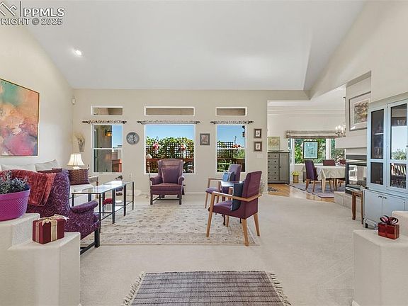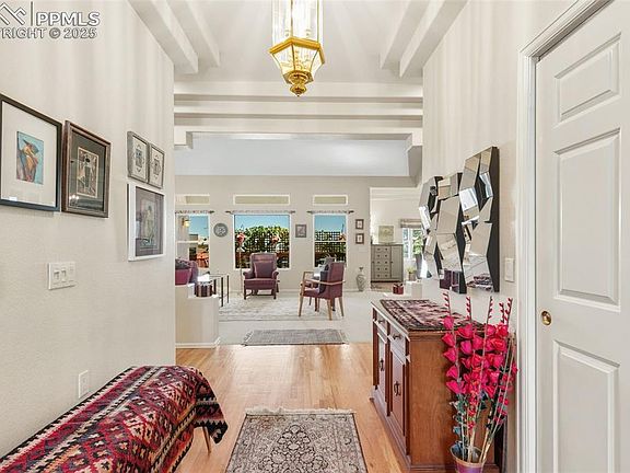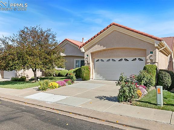 Beautifully landscaped with clean architectural lines, this elegant ranch-style home is nestled within the private, gated 55+ community of La Scala. Designed for effortless main-level living, it also offers a spacious, fully finished lower level, perfect for guests, entertaining, or family visits. Upon entry, you’ll immediately notice the attention to detail and quality craftsmanship throughout. Rich hardwood floors, coffered ceilings, and architectural design elements create a warm yet sophisticated atmosphere. The grand entry opens to a light-filled great room featuring newer Pella windows, a three-sided fireplace, and access to an oversized, partially covered deck which is ideal for outdoor relaxation and gatherings. The dining area flows seamlessly between the great room and kitchen. The gourmet kitchen is fully equipped with top-of-the-line appliances, oversized cabinetry, an enormous pantry, expansive slab countertops, and stylish designer finishes. The updated primary suite offers a serene retreat with a spa-like ensuite bath featuring a separate standalone shower, jetted tub, dual vanities, and a walk-in closet. A second main-level bedroom includes its own private full bath, while a dedicated study, half bath, and laundry room complete the main floor. The finished two-car garage, with treated floors, connects conveniently to the laundry room. The garden-level basement is equally impressive, boasting two large family rooms, a wall of custom cabinetry for an entertainment center, a wet bar, and a cozy gas fireplace. Two additional bedrooms share a connecting bath, and a large, finished space provides the perfect area for exercise, hobbies, or storage. Recent updates include a newer furnace, radon system, stucco exterior, tile roof, and windows. Ideally located near shopping, Quail Lake, and with easy access to I-25, Hwy 115, Fort Carson, and downtown, La Scala is a highly desirable community, truly an exceptional place to call home.