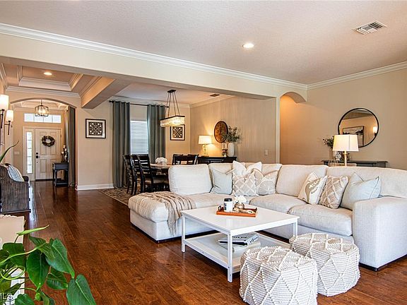 GORGEOUS FURNISHED 3-bedroom + den, 2.5-bath home featuring stunning mature landscaping and bright southern exposure! This residence boasts volume ceilings with crown molding throughout and an open, split floor plan that creates a spacious, inviting atmosphere. Custom fireplace and beautiful woodwork sets this home apart from any other. The huge chef’s kitchen is a showstopper with custom cabinets, granite counters, a pantry, breakfast bar, beverage fridge, stainless steel appliances, and a large island—perfect for entertaining or everyday living. The owner’s suite offers a private retreat with a walk-in closet, dual sink vanity, and an expansive walk-in shower. Beautiful wood floors run throughout the main living spaces, with carpet in the bedrooms for comfort. A formal dining room and eat-in kitchen provide multiple dining options. Step outside to your private salt water pool with a fully fenced deck area and an under-truss lanai with roll-down hurricane screens, ideal for relaxing or entertaining year-round. Garage comes equipped with a Tesla charging station and for the right price the Tesla is included! Come enjoy the Florida lifestyle at one of Cape Coral's most desired GATED communities. Sandoval is known for its relaxed lifestyle living with plenty of activities for all ages! RESORT STYLE POOL, FISHING PIER, 2 DOG PARKS, KIDS PLAYGROUND, BOCCEBALL, VOLLEYBALL, BASKETBALL AND TENNIS COURTS just to name a few. Call today to schedule your private tour!