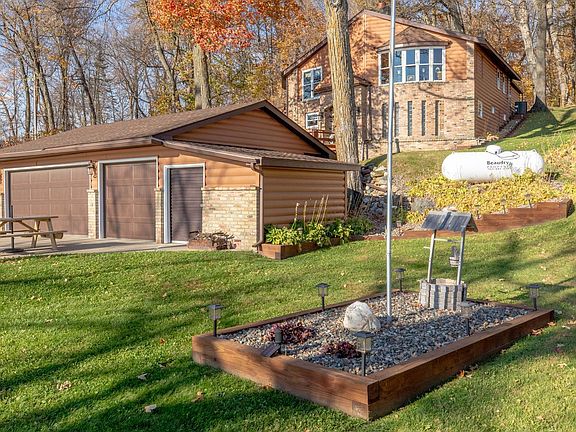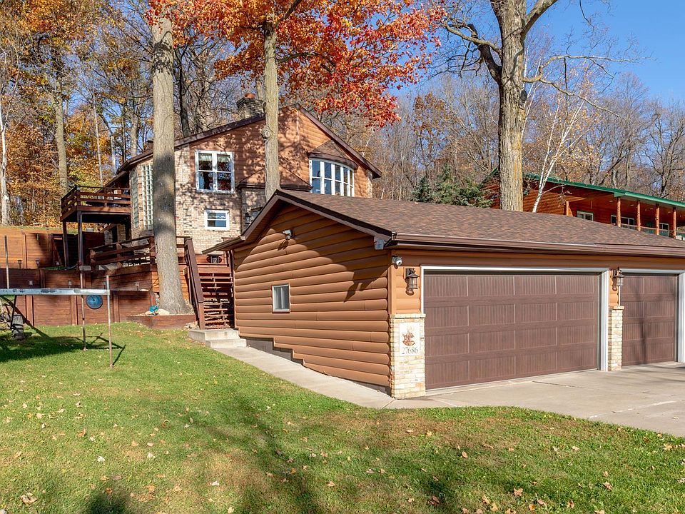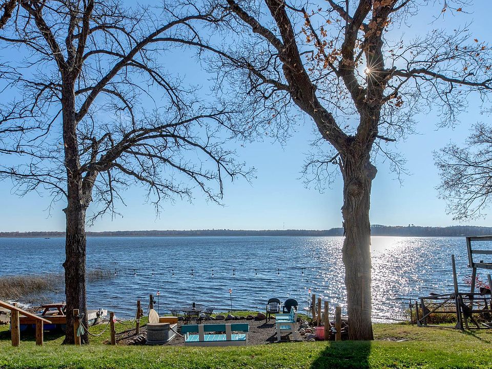 Wake up to breathtaking lake views every day in this two-story hilltop home perched above the water’s edge. Built for year-round living, every major system is brand new within the last few years; roof (house + garage), insulated vinyl log siding, skylights, energy efficient windows, furnace, central A/C, tankless hot water heater, garage doors, newly remodeled kitchen with stainless steel appliances, freshly built decks, new landscaping, retaining walls, 40-foot private dock, floating picnic table, and a private sandy beach with dedicated sitting area. Angler’s dream; amazing fishing for walleye, crappie, sunfish, northern pike, and bass right off your dock.