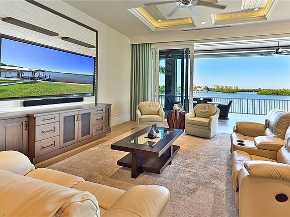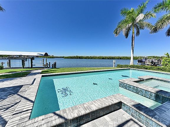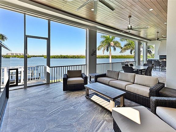 The ultimate bay front home is now available for immediate purchase and move in. This 3 story 4 bedroom + den home sits on over a half an acre bayfront lot with water on 3 sides with western exposure and south and west sun on the swimming pool and spa and the covered boat dock with lift provides premier boating with easy access to the Gulf both through the north and south passes and a very short walk to the beach! A new seawall, that was substantially raised, was installed when the home was being constructed. The home was built in 2018 by Damon Custom Structures (DCS), plans by RG Designs and with just under 4,000 AC sq ft and 9,144 total sq ft of living space the emphasis was on views, quality and living on one level. The features include: open floor plan with wide bay views form the great room, dining room, kitchen and bar which all open to the screened and electric shuttered oversized covered lanai with seating area, fireplace & tv, summer kitchen with gas grill and sit at bar all overlooking the swimming pool, spa and bay. The sliders pocket all the way to allow the indoor and outdoor areas to merge into one for the best in entertaining. The amenities include 12’ ceilings with incredible ceiling details throughout, wide plank wood floors, custom kitchen cabinets to the ceiling, gas cooktop, large sit at kitchen island, best in appliances including full size cabinet built in refrigerator at the bar, custom millwork and doors. The main floor master bedroom has sliding glass doors to a private lanai area with long water views, beautiful built-in closets, an en suite bath with his and her areas, walk around shower and top of the line Toto toilet. The guest bedroom on the main level is currently being used as a craft room with desk area. The office with custom built in desk & cabinetry, laundry and powder bath complete the mail level. The 3rd level features the two other guest bedrooms with large en suite baths both with water views and access to the covered lanai and the most amazing views and sunsets. The swimming pool, spa and deck sit right on the bay with walkways to the home and dock providing ample room for a great pool party. The fenced in yard is large enough for kids, grandkids or your pets to play. The garage level offers room for 4 cars plus all the toys you can think of and a large storage area. A private elevator, control 4 electronics audio video with ceiling speaker system, security system with cameras, all concrete construction, Anderson impact windows, impact doors and garage doors, epoxy floors, standing seam metal roof with secondary water resistance and a whole house generator complete this incredible opportunity. Best of all this home shows as new and comes furnished and ready to move in.
