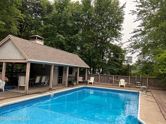 Discover the perfect blend of spacious luxury and versatile living in this nearly 4000 sq ft home, presenting a legal in-law apartment, ideal for extended family or generating rental income. Boasting two kitchens, dining rooms, and living rooms, it's an entertainer's dream. The property features a colossal inground pool, a pool house, cathedral ceilings, skylights and granite countertops, creating an elegant atmosphere. Numerous decks, patios, and a wooded backyard offer serene outdoor spaces. With the added convenience of a new roof, the three-car garage with a carport and studio area above provides functionality and practicality. Just 20 minutes from Saratoga, Lake George, and West Mountain, this residence combines luxury with a convenient location. Call for Airbnb income.