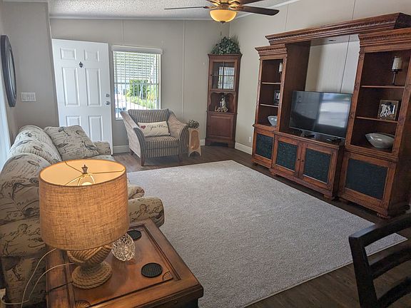 Located in an Active 55+ community! Be sure you do not miss out on this Special Offering ! This home comes with many extras starting with freshly painted exterior - looks beautiful. New window shutters. Roof is less than 2 years old. Home A/C is 2 years old with a 10 year warranty ! New cabinets in kitchen and both bathrooms !! Golf Cart is one year old with lithium batteries and is included in the sale. New fans in the kitchen, living room and main bedroom. Yard irrigation system has been refurbished. Single wide driveway with ample parking. Nice sized shed. Partially Furnished. Keep this home on your list to see ! Someone is going to be calling it home !!