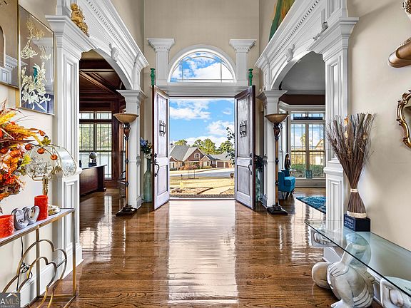 Situated at the end of a quiet cul-de-sac on one of the highest points in the county, this home offers sweeping views and an impressive architectural presence. A grand two-story foyer welcomes you inside, showcasing intricate trim-inlay ceiling details and stunning hardwood floors that flow throughout much of the main level. The primary suite is conveniently located on the main level and includes thoughtful touches such as overhead reading lights, recessed speakers, and a spacious custom closet outfitted with built-ins, a large center island with drawers, and additional wall storage. The luxurious ensuite bath features a jetted soaking tub and an expansive shower equipped with an overhead rain fixture and two additional showerheads. Recessed audio extends throughout the home-including the 4-car garage-enhancing both daily living and entertaining. Premium travertine tile flooring is featured in the kitchen, all bathrooms, and the laundry room. The chef's kitchen is a standout, equipped with high-end JennAir appliances, including a double oven, gas cooktop with griddle, separate wall oven, and built-in microwave. Full-size Additional features include a convenient pot filler, walk-in pantry with automatic lighting, and under-cabinet lighting that highlights the space's elegant design. The upper level features spacious secondary bedrooms, each equipped with custom built-in closet systems and generously sized bathrooms. An additional flex area upstairs provides the perfect space for a media room, playroom, homework loft, or lounge. The finished terrace level offers an ideal in-law or guest suite, complete with a full kitchen, private bedroom, and bathroom. This level also includes wine cellar, a media room with seven luxury theater chairs, and an unfinished storm-shelter/storage room, providing both comfort and peace of mind. The backyard delivers true resort-style living, centered around a custom inground PebbleTec heated gunite pool with a tanning ledge, cool deck, flagstone surround, and hot tub. A terraced hardscape with beautifully crafted flagstone steps leads down to an inviting outdoor fireplace with a built-in bench and accent lighting, creating the perfect setting for evening gatherings. The pool area is fenced for privacy and features a meticulously manicured zoysia lawn with a large, level area ideal for play or relaxation. Outdoor living continues with a Trex deck off the family room, complete with steps leading to the lower level, and a charming screened porch off the kitchen, perfectly positioned to enjoy sunset views overlooking the impressive backyard oasis. The four-car garage is equally well-appointed, featuring a utility sink with hot and cold water, pegboard walls, and organizational hooks, offering convenience and functionality for storage, hobbies, and everyday use.