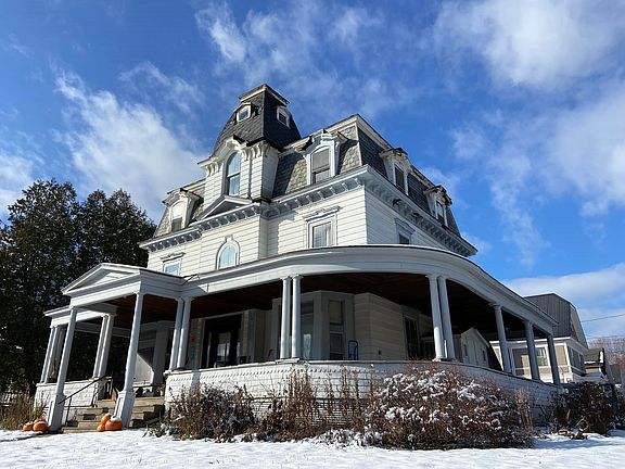 If you live in St. Johnsbury you probably recognize this as one of the most architecturally unique houses in town. Built in the late 1800s, in the Second Empire Victorian style, this massive home retains many special features: mansard roof, tower, wrap around porch, curved window casings, bay windows with leaded glass, ornate lintels and bracketed eaves (and that's just on the outside). Inside there are French doors, hardwood floors, built-ins, original moldings, a marble fireplace, solid brass radiators, and tall ceilings. Now that I have the historic home fandom items out of the way you might be wondering how the inside is laid out... As you might expect, the former 'Calderwood's Rooming House' has lots of space, about 4500 square feet of it. The ground floor has 2 apartments, both currently occupied. The 2nd floor has one apartment nearly finished with room for 1 or 2 more apartments depending on how you choose to finish it off and where you locate walls. The 3rd floor is set up as yet another large apartment, but needs finishing. The house does need work as even the untrained eye can see. The roof and soffits in particular are in need of restoration. New roof shingles are included with the sale so that's a start. Plumbing, wiring and interior have all had major updates in recent years. Take pleasure in restoring a truly worthwhile and enduring building while adding to a small town's much needed rental housing stock.