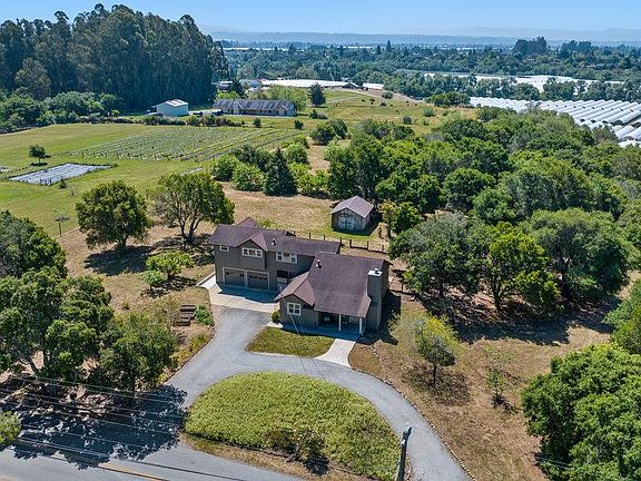 Privacy meets convenience on this stunning 3.8-acre Corralitos estate with panoramic mountain views and all-day sun exposure. The architect-designed 3BR/2BA home plus office features soaring knotty pine ceilings, passive solar elements, hardwood floors, and a Wolf range. Enjoy indoor-outdoor living with the primary suite opening to a private view deck. Recent upgrades include new carpet, double-pane windows, and a beautifully maintained orchard with mature fruit trees and automatic irrigation. The property includes a vintage barn with new roof, hot tub, large two-car garage, and covered storage. Located in the desirable Aptos school zone along the Corralitos wine trail, just minutes from Corralitos Market & Sausage Co., a 15-20 minute drive to Aptos, and 25 minutes to beaches. Santa Cruz County zoning allows for residential use with agricultural activities on this generous parcel. Flat, usable land with fertile soil perfect for gardening enthusiasts or small-scale farming. A rare opportunity to own a sun-drenched country retreat with the perfect blend of privacy and accessibility.