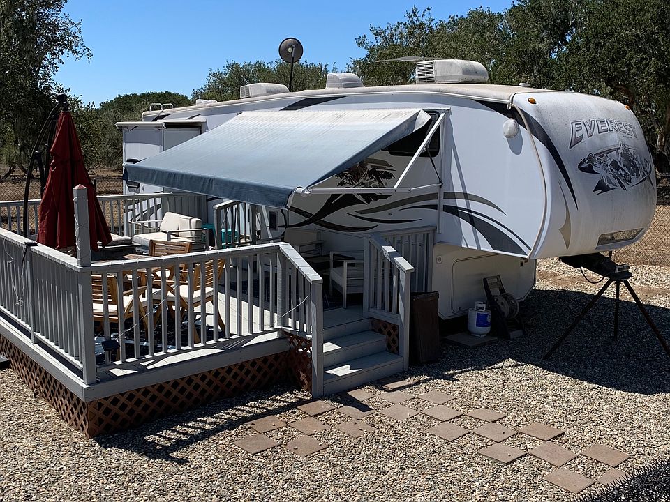 Very spacious and comfortable trailer for rent, with all the necessary amenities, a lark deck, fire pit, patio furniture, outdoor dining table, umbrella, fenced yard, all utilities included, except propane and internet, complete privacy on 25 acres ranch, no pets allowed 1 year