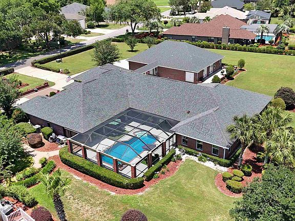 Luxury Golf Course Estate on expansive double lot with Guest House and 7 Car Garage. Welcome to this one-of-a-kind golf course property ideal for the avid golfer and entertaining lifestyle. Designed for the discerning homeowner, this home offers 5,760 square feet of combined living space, including a stunning main residence and a 4-yr new private attached guest house for multi-generational living, hosting friends and family or possible rental option. The home is perfectly situated overlooking the 4th green and 5th tee box of the Club at Hidden Creek, top rated golf course in NW Florida. The Main Residence features 4,525 sq. ft. with 2 oversized primary bedrooms with en-suites, additional guest bedroom, guest bath and an additional space which can be used as an office or possible 4th bedroom. Upon entry, you are greeted with an expansive view of dining room, kitchen and living area with multiple French door views to covered pool entertainment spaces. The kitchen showcases an abundance of custom cabinetry, pantries, granite counters, Viking gas range, and Bosch stainless steel appliances. As you leave the kitchen area and walk through the bricked hallway with lots of natural light, you enter an entertainer’s dream room. Oversized space featuring a full bar with granite counters, wet bar, beverage center, ice maker, and dishwasher. Room also features additional ½ bath and access to your separate golf cart garage. The outdoor pool area features a screened enclosure with sundeck, outdoor kitchen and plenty of covered space to entertain. The main residence also includes a 3-car garage. The private and self-contained Guest House offers 1,235 sq.ft., 1 BR, 1 and ½ baths, full kitchen, dining / living room, laundry room, climate-controlled storage and an attached oversized 4 car garage. This property is more than just a home; it's a lifestyle.