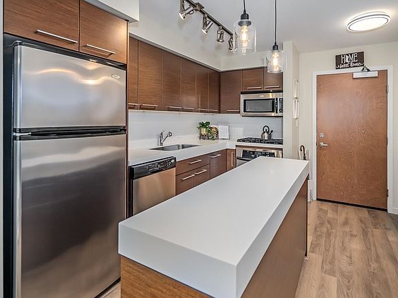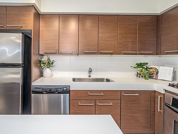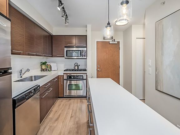 Floor-to-ceiling windowsStainless steel appliancesGas rangeWhite oak laminate floorsOversized balconySun-drenched denHome office