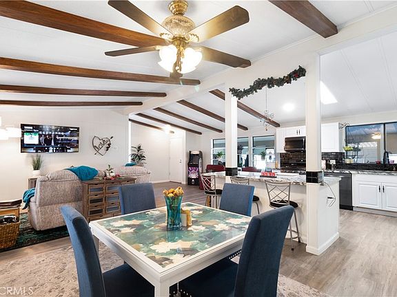 Welcome to 27701 Murrieta Rd #265, Menifee, CA 92586. Discover this fully upgraded 2-bedroom, 2-bathroom home in the desirable Hillside Mobile Home Estates, a 55+ community. Nestled on a spacious lot, this move-in-ready property boasts 1,440 sq. ft. of open living space with stylish upgrades throughout. Step inside to find soaring beamed ceilings, abundant natural light, and a welcoming living room that flows seamlessly into the formal dining area. The beautifully remodeled kitchen features sleek white cabinetry, a custom backsplash, a central island, a new sink, and brand-new stainless steel appliances. Additional upgrades include fresh interior paint, new LVT flooring, updated electrical outlets with GFCI in wet areas, and energy-efficient LED lighting throughout. Stay comfortable year-round with the 5-ton central AC condenser and heating system. The generously sized bedrooms include one currently set up as an office with a Murphy bed, while both bathrooms showcase updated showers and bathtub surrounding with glass sliding doors and stylish tile work. A large laundry room with a utility sink adds convenience. Outside, the attached carport provides covered parking, and a detached shed offers extra storage or workshop potential. Residents of this vibrant community enjoy a clubhouse, billiards room, and refreshing pool. Conveniently located near shopping, dining, and major freeways, this home perfectly balances comfort and accessibility. Don't miss this exceptional opportunity, schedule your showing today!