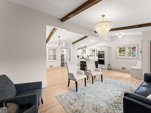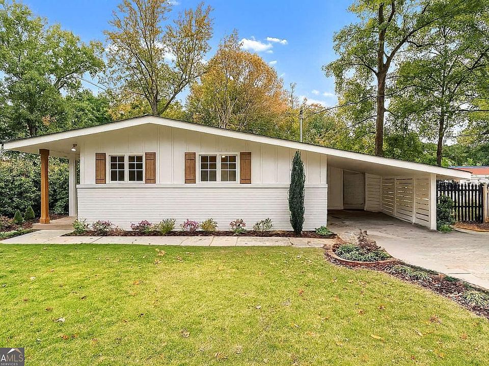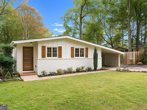 Completely Renovated Mid-Century Modern Gem. Every inch of this stunning mid-century modern home has been thoughtfully reimagined, blending timeless architecture with today's modern comforts. Featuring updated electrical and plumbing systems, a new roof, fresh exterior paint, custom wood accents, brand-new deck, and professional landscaping, this property is truly move-in ready and visually captivating inside and out. Step inside to discover vaulted, beamed ceilings and gorgeous restored hardwood floors that set the tone for the home's character and charm. The designer kitchen showcases creamy white main cabinets, a dramatic black accent island, double ovens, gas cooktop, and elegant finishes-perfectly positioned to open into the living and dining areas for seamless entertaining. The primary suite feels like a true retreat, featuring a beautifully remodeled en suite bathroom with a walk-in glass shower and double vanity. The design crew has also added a custom wardrobe that will remain with the property, providing gorgeous, functional storage that complements the home's modern aesthetic. Two additional bedrooms on the main level provide versatility for family, guests, or a home office. The secondary full bath has been completely renovated and includes a closet designed for a stackable washer and dryer tucked neatly behind stylish bifold doors. The terrace level is all new, featuring durable LVP flooring, a beautifully redone bathroom, and flexible space perfect for a media room, home gym, or guest suite. Outside, enjoy the freshly landscaped yard, brand-new deck with modern railing, and a covered carport that includes a fully enclosed laundry room with a window, complete with power, water, and a drain line-ideal for everyday use or an easy conversion into an outdoor wet bar or prep area for entertaining. Located in a prime Smyrna location, this home offers easy access to I-285 and I-75, making commutes around Metro Atlanta effortless. You'll love being close to local parks, The Battery at Truist Park and Smyrna Market Village, with shopping, dining, and entertainment plus two executive 18-hole golf courses and driving ranges, Fox Creek and Legacy Golf Links, all just minutes away. This home perfectly captures the spirit of mid-century modern design while offering the confidence and comfort of a full modern renovation. A true showpiece inside and out! The home is currently staged as pictured unless otherwise noted. Any AI staging is labeled accordingly in the listing photos.