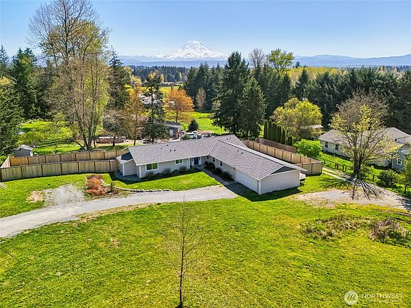 Discover this beautifully updated 3 bedroom, 1.75 bath rambler on a sprawling 38,333 sqft, double parcel lot with breathtaking mountain views! VERY MOTIVATED SELLER! Featuring luxury plank flooring, a stunning kitchen w/ quartz countertops, white cabinetry & recessed lighting & a primary suite w/ a walk-in closet & spa-like ensuite w/ tiled shower. Recently added heat pump w/ AC! Stay warm through the cooler months w/ the pellet stove. Spacious covered patio off the kitchen leads to private fenced yard w/ fire pit. Expansive flat lot with/ fruit trees, incl. apple, pear & citrus. Enjoy ample space w/ a 2-car garage, RV parking, & an extra workshop. Easy commute to JBLM.