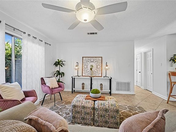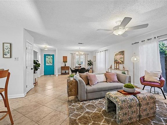 Welcome to a home brimming with Southern charm! Tucked away on a quiet street, this residence offers exceptional curb appeal, highlighted by a shady oak tree and a vibrant front door. Inside, you'll discover open dining and living spaces that provide true flexibility for personalization. Fresh paint and tile floors contribute to a cool, low-maintenance living environment. A versatile bonus room is well suited for a home office, playroom, or media room. The kitchen features gorgeous granite countertops, ideal for casual dining with counter stools, and warm cabinetry providing ample storage, including a pantry. The brand new stove and open floor plan are wonderful for entertaining friends and family. The home offers three well-proportioned bedrooms with new carpeting, ensuring comfort on cooler days. The light-filled primary suite boasts a large custom closet and an en-suite bathroom. French doors from the primary suite lead to a lovely patio and lush green space. The mature garden and fenced yard create a private backyard sanctuary, perfect for quiet enjoyment or hosting gatherings. Storage is abundant with a garage and an additional storage shed. Peace of mind features include new underground plumbing (2025), AC unit replaced in 2019, located in an X Flood Zone, and under a termite contract. Enjoy convenient access to Oakdale Park and a quick drive to various shopping and dining options. This home is a true gem-schedule a tour today!