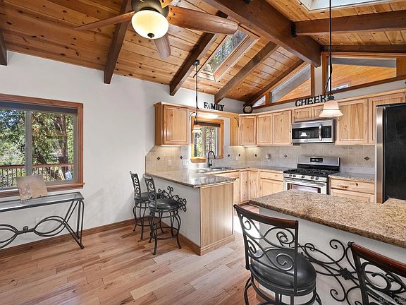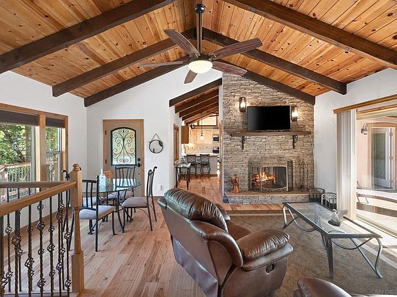 Welcome to this stunning Idyllwild mountain retreat and true dream home! This beautifully maintained, turn-key property reflects tremendous pride of ownership and meticulous attention to detail. The home feels almost new inside, with nearly every inch thoughtfully renovated or upgraded over time. From the moment you step inside, you’ll love the exposed wood-beam ceilings, hand-scraped hickory floors, and ..... See Suplement charming knotty pine doors and casings. Significant improvements completed in recent years include a newer roof, Hardiebacker exterior siding, upgraded windows, a highly efficient furnace, and an oversized 50-gallon water heater. Enjoy your morning coffee or entertain friends on the expansive TREX decking that surrounds the home. It’s the perfect spot to relax while watching peaceful mountain wildlife, including the occasional mama deer with her fawn or playful squirrels wandering through the backyard. The main level features the living and dining rooms with a gorgeous split-face stone fireplace that opens to the kitchen, as well as the primary en-suite bedroom, a secondary bedroom, and a full bath. The lower level offers wonderful flexibility: it can serve as a spacious third bedroom or as an oversized family/bonus room with a wet bar, half bath, and large storage room. During the last two years, the current seller has also added meaningful updates, including a brand-new 4-person ultra-red sauna, a new window A/C unit, and an 8x12 storage shed.