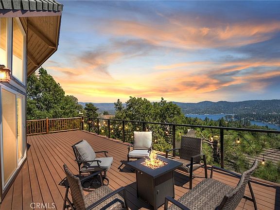 Looking for a GREAT LAKEVIEW mountain home? At a BELOW MARKET PRICE? Look no further -- THIS IS IT !!! ?Wow!?...will be your jaw dropping reaction when you enter this wonderful turnkey A-frame/prow mountain motif home - with LAKE RIGHTS - and see your unobstructed lake view and panoramic ridgetop views, including nearby Snow Valley and San Gorgonio, all from your deck chairs and firepit. This lovely home, with a great "cabin feel" and near level entry, exudes relaxation and fun, from the nearly 1,500 SF of lake view deck space, to the game room with a two in one game table with billiards, and table tennis. Don’t forget the relaxing Jacuzzi spa! The kitchen features hickory cabinets, recently updated stainless steel appliances, and a new LG refrigerator. Relax in the spacious A-frame/prow great room, with terrific lake and mountain views, and enjoy a cozy fire in your Regency airtight wood burning stove. The large master bedroom offers breathtaking views, deck and spa access, a gas insert fireplace for easy fires late at night, and plenty of built-in dresser space, along with a spacious walk-in closet. The master bath boasts a dual sink, a separate walk-in shower and jetted tub, as well as heated floor tiles and a heated towel rack! The additional two large bedrooms upstairs offer more lake views and quiet sitting areas. The main level game room could easily be converted to a fourth bedroom. All three bathrooms have charming, designer touches including mountain themed backsplashes and painted sinks. Be comfortable year-round with central heat and air conditioning. The home also has a laundry and work room, and a concrete and insulated basement for plentiful storage. A short term rental permit has been obtained, and is now a successful, high demand STR. This turnkey unobstructed lake view house at this price point is a rare find on the mountain. Seller is motivated, as evident by the below market pricing. Come see this gem now, and start enjoying the lake lifestyle at its finest!