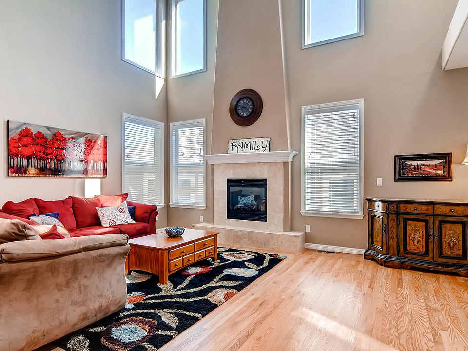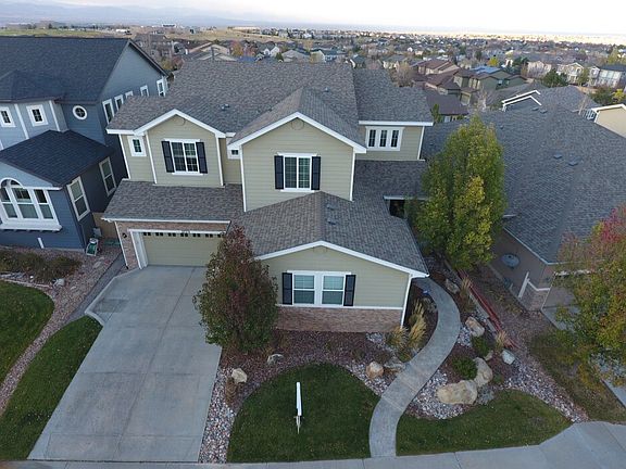 Immaculate 5,000 sq ft of living space with stunning views of Downtown and the Front Range! Captivating entry with 18 ft' vaulted ceilings, winding staircase, open living room with fireplace, main level bedroom/study with private 3/4 bath, formal living room with newer hardwood floors throughout the main level. Large chef's kitchen with granite counter tops, island with double oven, gas range and breakfast bar. Upstairs features 4 bed, laundry room and large master suite features fireplace, 5 piece bath with dual shower head and stunning views. Enormous, full finished walk-out basement with wet bar, media area includes surround sound speakers and 70 inch TV included and guest suite with 3/4 bath. Popular Shea Home's Alberta Model professionally landscaped front yard with stamped concrete entry, ,exterior lighting and low maintenance back yard with flagstone patio. Walking distance to Copper Mesa Elementary, Mountain Ridge Middle and Mountain Vista High Schools, Red Tail Parks or hike/bike Backcountry trails out your front door. Call Chris Grund Domaine Real Estate 303.815.2505 for more information. Quick possession!