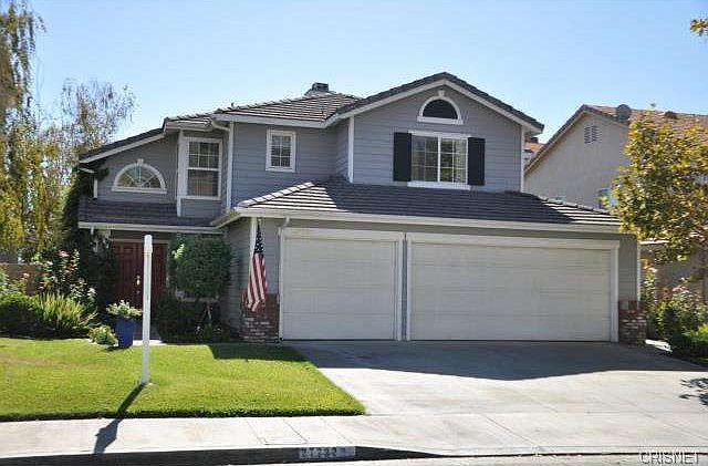NICE SAUGUS 4 BEDROOM WITH PRIVATE POOL SIZE LOT + TERRIFIC VIEWS!!! Open floor plan with bedroom down (used as office with desk), 3 bedrooms up. Vaulted ceilings, wood floors, stainless appliances. Huge grassy lot with patio cover, views looking out over Bouquet Canyon, nice privacy & neutral decor throughout. A winner!