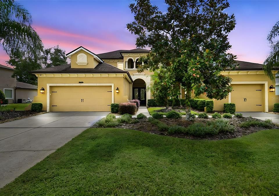 Seven Oaks. Gorgeous cul-de-sac home on magnificent conservation lot in gated Watermark, Seven Oaks most prestigious village. This 4 bedroom, 3 ½ bath, 3 car split garage residence also has a loft, theater room, bonus room and an oversized, covered and screened lanai. The soaring ceilings provide for a very open feeling. The large kitchen with an island has upgraded stainless steel appliances, eat in area, walk-in pantry, overlooking the huge family room. The oversized first floor primary suite has views of conservation, dual sinks, walk-in closet, shower and separate tub. The family room is open to the second floor providing an abundance of natural light, and has two oversized bedrooms, one with access to large balcony, a bath with double sinks, a loft, theater and large bonus room. This home has many upgrades, including but not limited to guest bedroom on first floor, extensive wood floors, extensive plantation shutters, upgraded tile, large dining room & living room combination, screened travertine lanai with a half bath, split garages, sprinkler system, alarm system, gutters, acrylic coated garage floors, and a stately entrance with a front porch. Located in Wesley Chapel just off I-75 and Highway 56, Seven Oaks is a 2,000-acre residential community set among grandfather oaks, pine trees, miles of nature trails, and pristine conservation areas. Seven Oaks is a master planned community with a variety of neighborhoods. Seven Oaks features tree-lined entranceways, neighborhood parks, and a multi-million-dollar community center with all the amenities including 3 pools (one with a double loop slide), theater, gym, café, sports fields, tennis and much more. This home is located only minutes from shopping, I-75, hospitals, restaurants, recreation, VA, USF, Moffitt, and entertainment. Come see for yourself this exquisite residence, sit down, relax and call it home! Please see Matterport 3D tour.