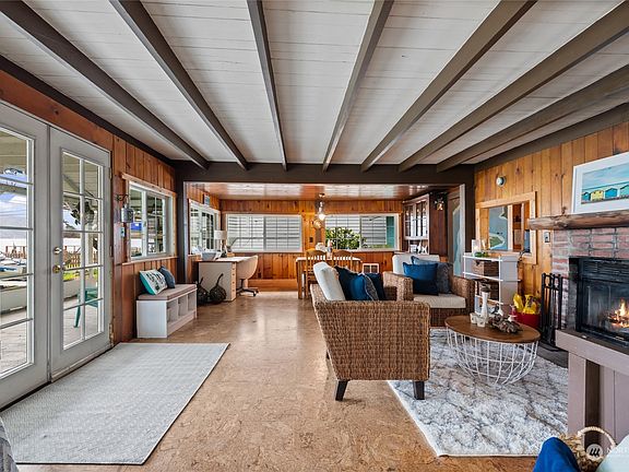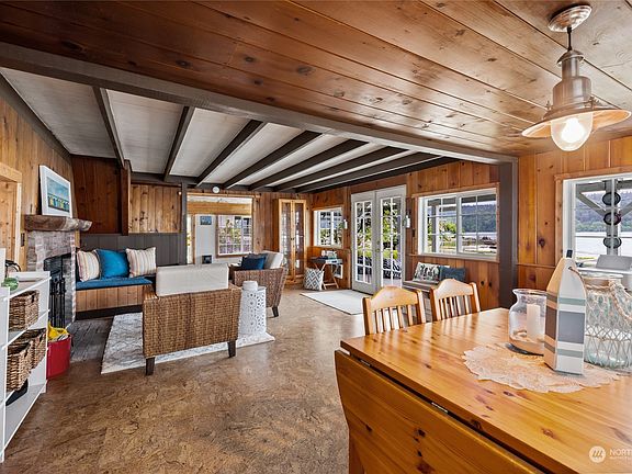Picturesque waterfront Island living with sweeping water views and direct access to the shoreline. It's a dream for those seeking serenity and outdoor adventure. The large, covered deck provides a perfect spot for morning coffee or evening sunsets, while the fireplace ensures cozy comfort during colder months. Charming features include built ins, beam ceilings, cedar walls and ceilings, french doors and lots of windows bringing in natural light. The additional room on the upper level, complete with a balcony, offers even more opportunities to soak in the stunning surroundings. Plus, the extra storage sheds provide practical convenience. It is an idyllic retreat for anyone looking to embrace the Pacific Northwest lifestyle.