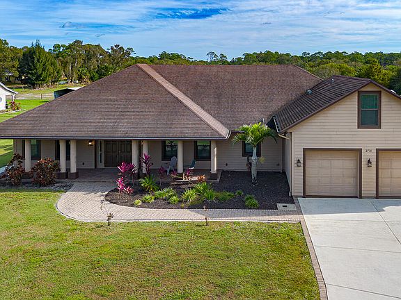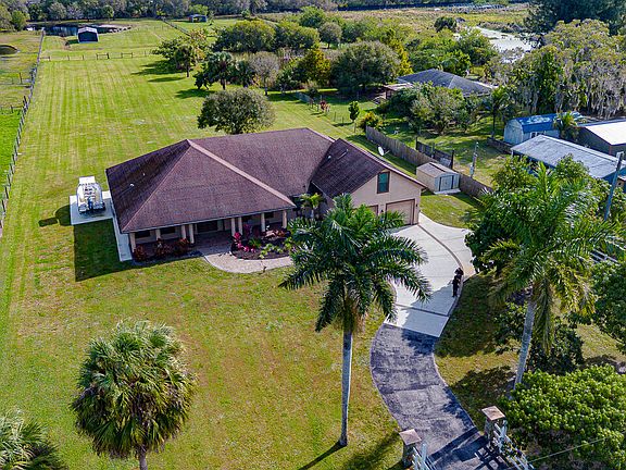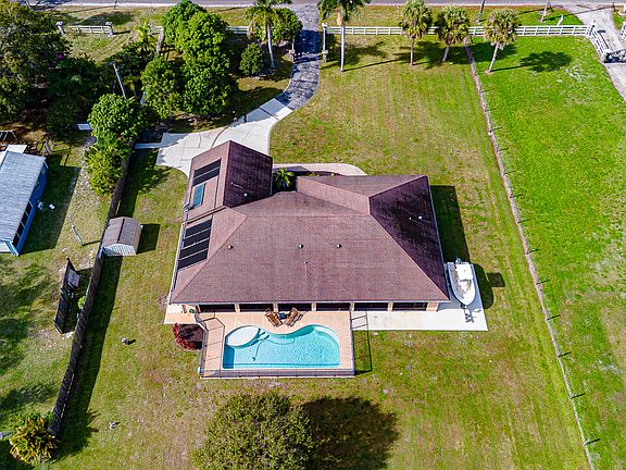 Welcome Home! This beautifully maintained, custom ranch home on 2.99 fenced acres at the end of private paved road features 4 beds + game room/office/ possible 5th bedroom, 3.5 baths, & 2.5-car garage. Master features HIS/HERS baths & HIS/HERS Walk In Closets! Enjoy stunning views of lakes, wildlife, & mature landscaping. Boasting cathedral ceilings, a chef's kitchen w/ Cherrywood cabinets, quartz counters, & top-tier gas stove. Entertain with ease in the 880 sq ft screened lanai w/ full outdoor kitchen & fireplace or relax in the saltwater pool w/ solar heat. Includes a 2-stall barn, RV/boat pad with 220V, whole-house reverse osmosis, HUGE walk in insulated attic, central vac, & more just 10 mins to beaches & 2 miles from I-95 & Turnpike! Seller offering low % financing Surrounded by manicured grounds, mature oaks, tropical palms, fruit trees (including three varieties of mangoes), and scenic views of two shared lakes populated with swans, ducks, and native birds. Across from private land filled with deer and antelope this property is truly a peaceful rural retreat.