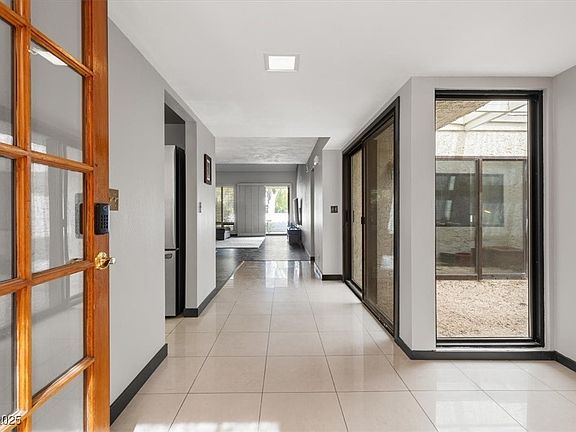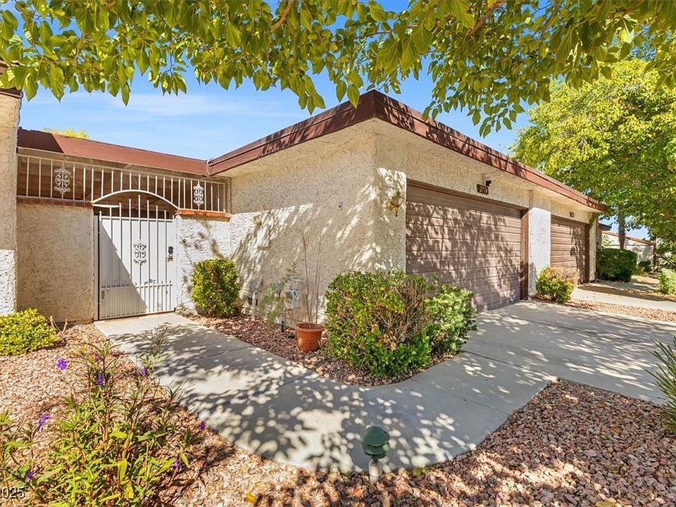 This truly unique & beautiful 1-story, 2 bedroom + a Den (easily a 3rd bedroom), Townhome is located in the highly desirable Sunrise Villas 8. The vibe is "Vintage Vegas". The appealing courtyard entry creates a private oasis offering a seamless indoor/outdoor experience. Double door entry into the home w/enclosed atrium bringing natural light w/endless possibilities (meditation, flower, herb & vegetable garden). The atrium offers views from the entry, primary bathroom & den. The kitchen is the perfect size w/newer appliances, a window that opens into the courtyard & its adjacent to the dining room. The living room offers a cozy fireplace w/sliding door out to your backyard patio w/gate that leads to the beautiful grounds & amenities (3 pools, 2 spas, tennis courts, walking paths). New in 2024 - all appliances, hot water heater, whole house water softener, breakers in panel in hall closet, & LVP. The HOA maintains your roof, front yard & common areas.