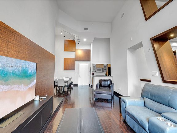 Elegant soaring 16-1/2’ ceilings, 1st floor, serene pool & garden view. 1+den or office/1.5 easy to convert back to 2/2. Open kitchen, custom closets/lighting, hardwood floors & details. New LG laundry, smart thermostat & lock; ceiling fan. Includes 2 garage spaces steps from apt.–no elevator needed, like living in a house! Rare storage (2) included. Fab schools Aventura Charter or Waterways K-8 & Krop. 24/7 security & valet, lovely attended lobby soon to be renovated, pools, business center, movie theatre, gym, sauna, hot tub, party room with pool table & TV. Maintenance includes basic cable, Wi-Fi, water, reserves+. Pet friendly. As-is, inspections welcome. In vibrant Aventura Town Center–walk to shopping, dining, gyms, theatre, Aventura Mall. Near beach-Bal Harbour-Gulfstream-airports