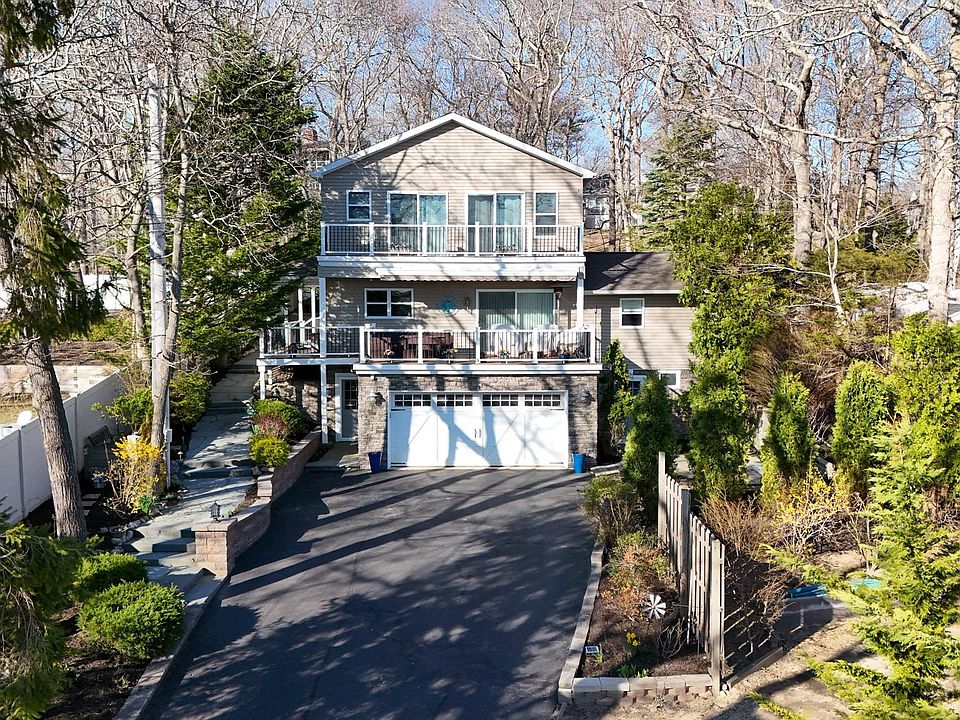 Meticulously maintained home with stunning water views in beautiful Fleet's Neck community! Enjoy views of Shagwong Marina and Wickham Creek as you dine in your open concept living space or outdoors on the deck relaxing under the shade of the roll-up awning. A short walk to Fleet's Neck Private Beach Association, one of the North Forks premier Bay beaches. This home boasts 2 spacious Bedrooms and 2.5 Bathrooms. The wood burning stone fireplace and abundance of natural light make for a welcoming living room experience. The first-floor den/office located just off of the main living area has a spiral staircase leading to the basement with additional office space and a ground level outside entrance. The primary bedroom is well appointed featuring water views through two patio doors leading to a private balcony, his & her's walk-in closets and an en-suite bathroom. An additional bedroom w/ walk-in closet, full bathroom and laundry room round out the second story. The finished basement with ground level entrance from driveway, large egress window and full bathroom make it easy to forget you are in a basement at all! A two-car garage, outdoor shower, and hot-tub hookup serve as additional amenities. Close enough to all the North Fork has to offer while retaining serenity make this home an ideal choice for seasonal or year-round living.