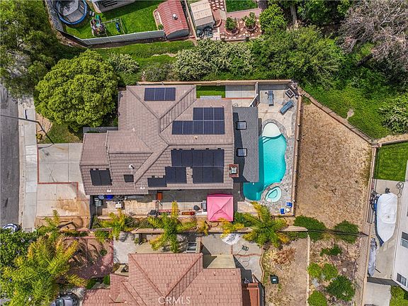 oversized dining room is open to the living room and great for entertaining. The other 3 bedrooms are upstairs and all bathroom vanities have been remodeled with granite countertops and rich wood cabinets. Hall bath is a Jack and Jill. There is an entertainer's backyard with a pool and spa which has recently been resurfaced; Also included, is a covered patio and built in BBQ. There is a upgraded gated dog run with artificial grass and a doggie door entrance to the house. The HVAC and water heater have been recently upgraded. As an added bonus, this home has SOLAR. Save on your electric bill!! Close to the 5 freeway, restaurants and stores. NO mello roos and NO HOA.