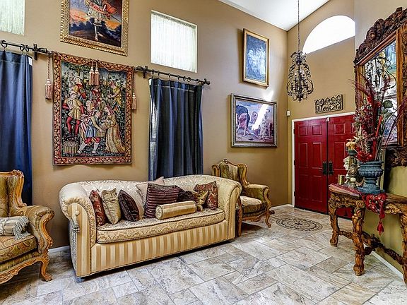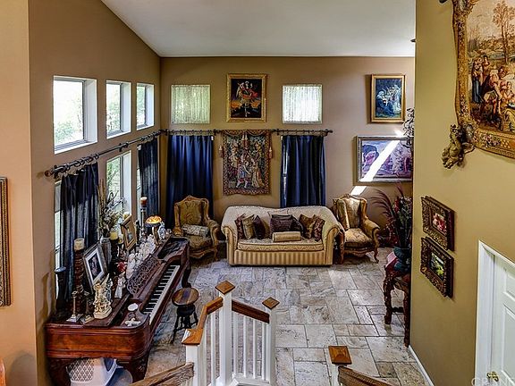 Great curb appeal at this beautiful four-bedroom Saugus home with designer touches! Downstairs flooring is travertine tile in Versaille pattern. Remodeled kitchen features granite countertops, tumbled travertine tile backsplash, island with hanging pot rack. Family room is wired for surround sound and there is a cozy slate stone fireplace. Separate eating area in kitchen plus formal dining room. Downstairs bedroom and bathroom. Master bedroom en suite boasts a recently-added huge balcony, and the master bathroom has a roomy walk-in closet, ceramic tile floor, private water closet, separate tub and shower enclosures with rainfall-style showerhead. Jack and Jill Bathroom with double sinks. Separate laundry room. Two-car garage and the third garage was converted to a man-cave (approx. 14âEUR(tm) x 12âEUR(tm)) with A/C for comfort. Private backyard faces the hillside, on which is planted with soil-retentive and fire-retardant foliage. Good-sized backyard. HOA amenities in this wonderful neighborhood include pool, tot lot, playground, and two parks. Come and see!