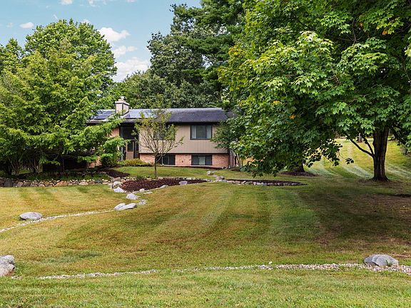 Discover this incredible mid-century bi-level home, perfectly situated on a sprawling 1-acre lot near a beautiful stretch of the Huron River. This residence boasts stunning curb appeal, highlighted by a stunning wrap-around balcony and meticulously maintained landscaping. Step inside the welcoming foyer with its wide stairway leading up to the entry-level living room. Here, massive windows flood the space with natural light, complementing the contemporary wood flooring and a charming brick fireplace. The spacious kitchen is a true chef's dream, offering an induction cooktop, double oven, and abundant cabinet and quartz countertop space - ideal for culinary adventures and shared moments. Adding to the home's impressive living area is a heated and cooled four-seasons room off the dining area, providing an additional 225+ square feet of luxurious space (w/new mini split). The owner's suite is a private retreat, featuring a skylight, a fashionable and recently updated bathroom, and a generous walk-in closet. This beautiful home also features solar panels, car chargers, new carpet in the basement, new water softener (2025), and the list goes on. Don't miss the opportunity to see this one-of-a-kind home.