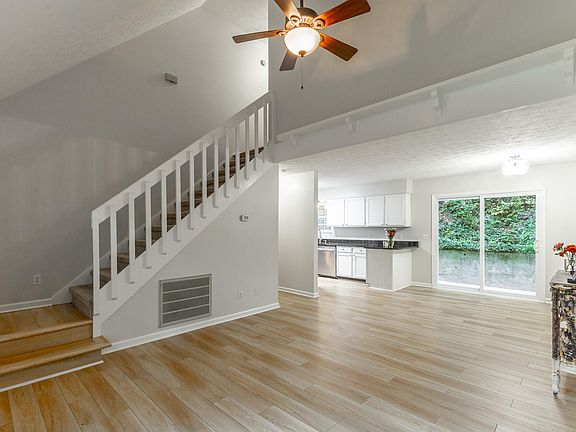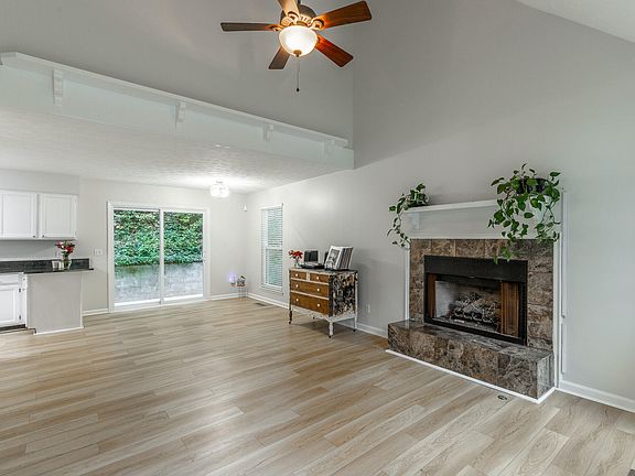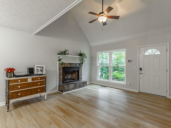As you turn into your quiet, tree-lined neighborhood, you'll know you've found your happy place. Nestled between two pockets of lush green space, this home offers both privacy and peace of mind. Step up the brand-new wooden staircase and enter your cozy, move-in-ready getaway, where new flooring, a vaulted ceiling, and a gas-burning fireplace set the tone for relaxed living.