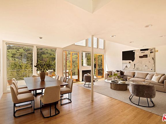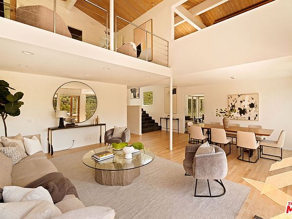 This mid-century modern retreat, designed by renowned architect Gwynne Pugh, offers an unparalleled indoor/outdoor flow with multiple decks and a lush, flat grassy yard, perfect for endless al fresco living. Inside, the main space features a soaring double-height ceiling, a fireplace, and oversized windows that frame breathtaking hillside views, complemented by glass French doors that open to one of the many balconies. The contemporary kitchen boasts extensive cabinetry, a large center eat-in island, and stainless steel appliances. The primary bedroom is located on the main level, featuring an en suite bathroom and two walk-in closets for ample storage. Upstairs, one traditional bedroom includes a private deck and an attached bathroom. A versatile loft space provides the third bedroom with a closet and a door leading to a deck. On the other side of the staircase, a home office features built-ins, a desk, and yet another large deck. A two-car garage adds convenient access. Tucked away for privacy yet centrally located, this home provides easy access to the Valley, Eastside, West Hollywood, and beyond.