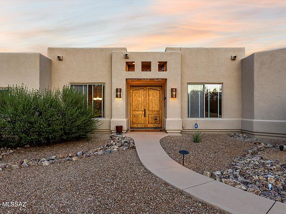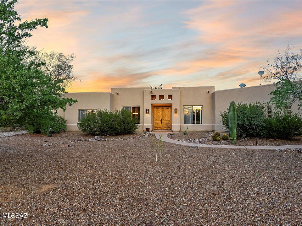 Enjoy wide-open spaces in this custom home on over 3 acres with stunning, unobstructed views of the Catalina Mountains. Inside, you'll find travertine floors, a great room with a fireplace, a split bedroom plan, a den, and a formal dining room. The gourmet kitchen features granite countertops, alder cabinets, and stainless steel appliances, complete with a breakfast bar and nook. The master suite offers a private sitting area for a peaceful retreat. The 3-car garage with freezer room provides ample storage. The expansive backyard features a beach-entry pool, spa, a separate large yard with fruit trees, and a spacious volleyball court/recreation area.