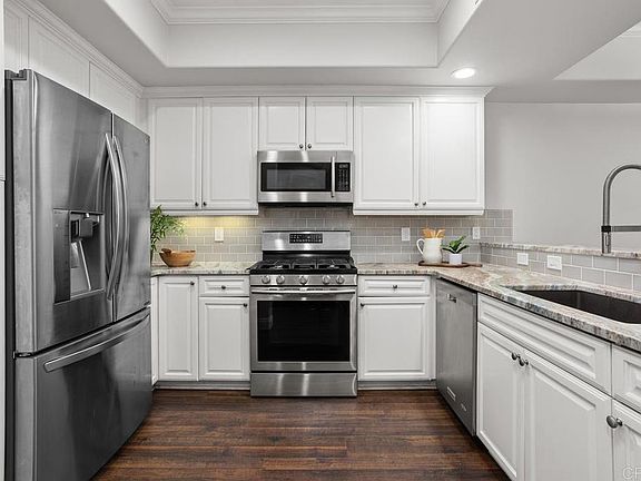 RARE CARLSBAD VILLAGE CORNER UNIT ONE BLOCK FROM THE BEACH! This gorgeous 2 bedroom 2.5 bathroom townhome is just steps from the sand and in the vibrant heart of Carlsbad Village. This spacious light and bright townhome has an open-concept living space featuring crown molding, wide plank laminate wood flooring and a seamless flow between the kitchen, dining, and living areas. The modern, remodeled kitchen boasts granite countertops, stainless steel appliances, and white cabinetry, designed for entertaining and the living room features a cozy fireplace. Step outside to your private balcony and enjoy the ocean breeze! The primary suite is a private retreat with a walk-in closet and an beautiful en-suite bathroom complete a custom oversized shower and updated vanity with dual sinks. There is also a spacious secondary bedroom with an upgraded bathroom. This secured building offers peace of mind and the unit includes dedicated gated parking with two spots and additional storage in the garage. Village By The Sea is a highly desirable condo community with a fitness area, spa and recreation center. With Carlsbad’s pristine beaches, boutique shops, top-rated restaurants, highly rated schools and the Coaster Station just a short stroll away, this stunning home is the pinnacle of coastal living.