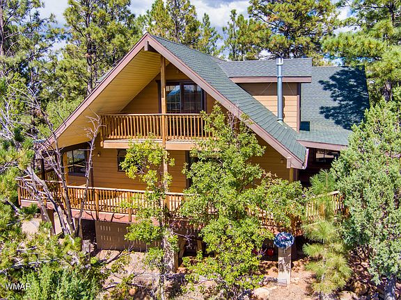 The Ultimate Private Mountain Retreat on almost 4 acres, bordering the National Forest with breathtaking views, awaits you! This well maintained 3 bedroom and 2 bathroom on 3.89 acres is nestled among tall, mature ponderosa pines and has all the features to start living in the mountains now. Interior features a spacious living room with a gas fireplace. Kitchen has plenty of counter space, knotty alder cabinets and an eating area with spectacular views of the National Forest. Large master on main floor with many windows to enjoy the trees and wildlife. Second level features a large loft with a balcony to enjoy your morning coffee with a stunning view, an additional bedroom and a workshop. Multiple storage cabinets throughout. Comes with Central heat and A/C. High speed internet availability. Exterior boasts 2 one car garages, wrap around deck with trex decking, covered RV parking, drip system, hard wired backup generator, and fully fenced. So many possibilities, do not wait and contact me for a private showing!